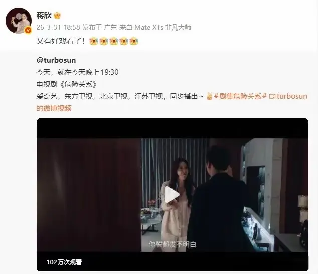4月1号的内娱社交平台,直接被孙俪蒋欣的神仙互动给霸了屏,没有铺天盖地的营销通稿,没有刻意买热搜炒热度,却凭着最真实的日常对话,戳中了无数甄嬛传老粉的心窝子。3月31号这天,孙俪筹备许久的全新力作《危险关系》,正式在各大平台上线开播,官宣动态刚发出去没几分钟,蒋欣就火速点开了自己的社交账号。她手指飞快转发孙俪的新剧宣传博文,指尖敲出又有好戏看了的简单配文,后面还跟着一连串蹦跳比心的打call表情,激动的模样藏都藏不住,比自己主演的剧集上线还要上心还要雀跃。这份毫无保留的支持,真的太让人暖心,完全是真心为好友感到欣喜,半点虚情假意的敷衍都找不到,看得出来两人私下关系是真的亲近。转天孙俪就特意蹲守在蒋欣的评论区里,放下所有一线女星的架子,用闺蜜唠嗑的软乎乎语气,轻轻柔柔追问对方。昨晚有没有准时蹲守追剧呀,看完剧情和角色喜不喜欢嘛,语气自然又亲昵,完全就是身边好朋友才会有的相处状态,半点明星的距离感都没有。蒋欣看到这条评论更是半点不耽搁,秒速就敲出了回复内容,简简单单说着自己是陪着妈妈一起看的,语气平淡又家常,没有华丽的修饰,没有刻意的煽情。就是这句再普通不过的生活碎碎念,直接把娱乐圈传了整整15年的两人不和传闻,狠狠砸了个稀碎,连一点残留的余地都没留下。老粉们刷到这一幕,瞬间就控制不住情绪红了眼眶,追了这么多年的剧,等了这么久的同框互动,终于等到了最圆满的结果,这种情怀真的没人能扛得住。